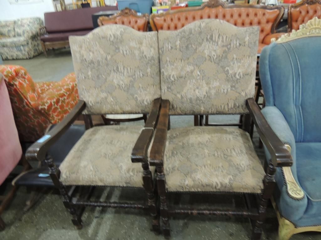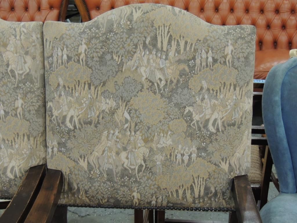 TAPESTRY HUNTING SCENE. UPHOLSTERY. PAIR OF CASTLE CHAIRS. ANTIQUE CHAIRS. AS SHOWN. SEE PHOTO FOR MORE DETAILS.