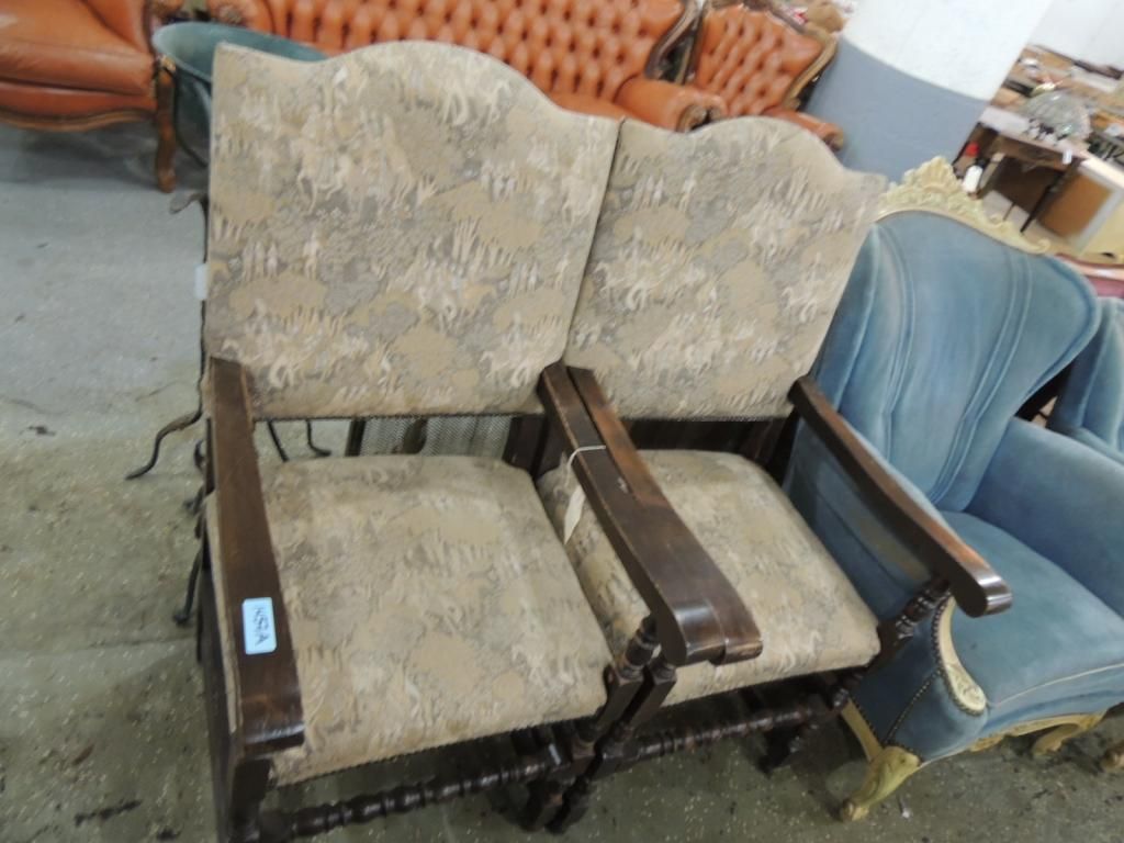 TAPESTRY HUNTING SCENE. UPHOLSTERY. PAIR OF CASTLE CHAIRS. ANTIQUE CHAIRS. AS SHOWN. SEE PHOTO FOR MORE DETAILS.