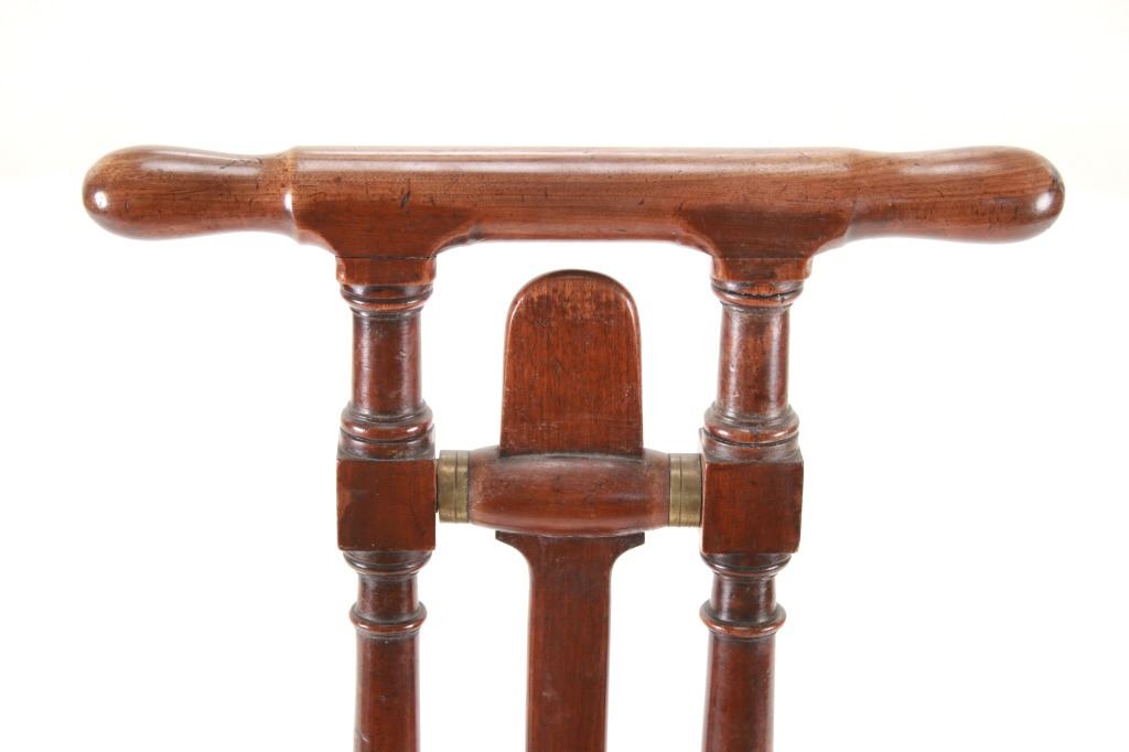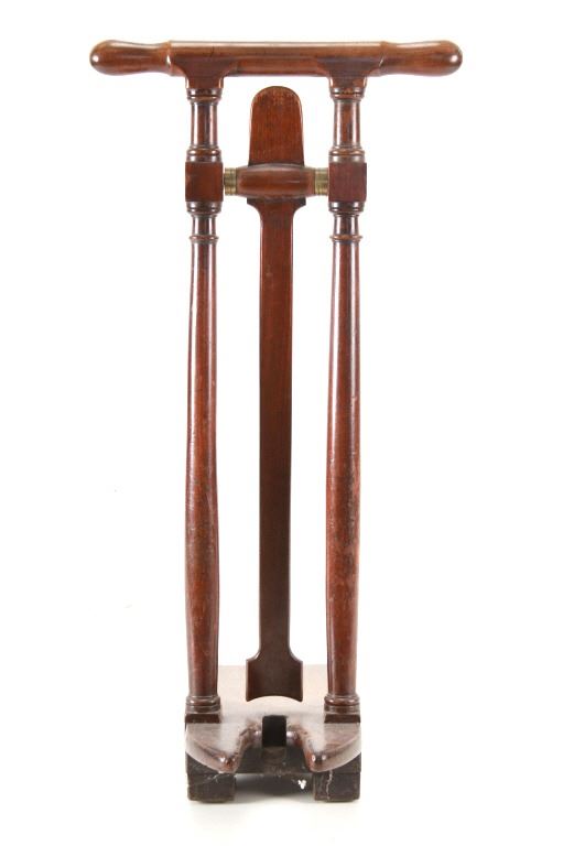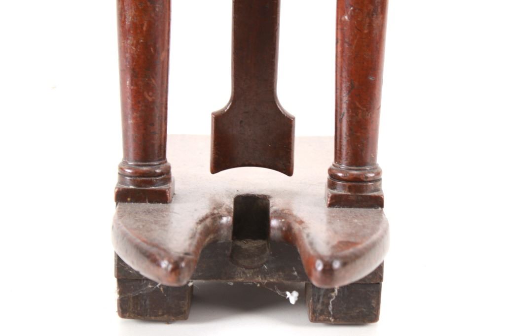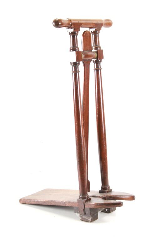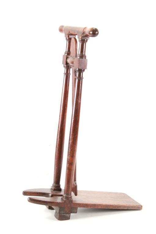 Featured in this lot is this beautiful Regency style oak 'country house' English boot jack from the mid 19th Century. This boot jack shows a very nice oak construction with brass fittings on the top of the toe hold. The top features a handle to hold on to as you take your boots off. To use the boot jack you set the heel of your boot in the front of the jack, then wedge your toes under the swinging toe hold and pull your boot off as you hold the handles. The piece shows good condition overall with slight wear present from its age and use, but no signs of damage is noted. It measures 20 7/8" L x 15 5/8" W x 32 1/4" H and weighs 7 pounds and 4 ounces.