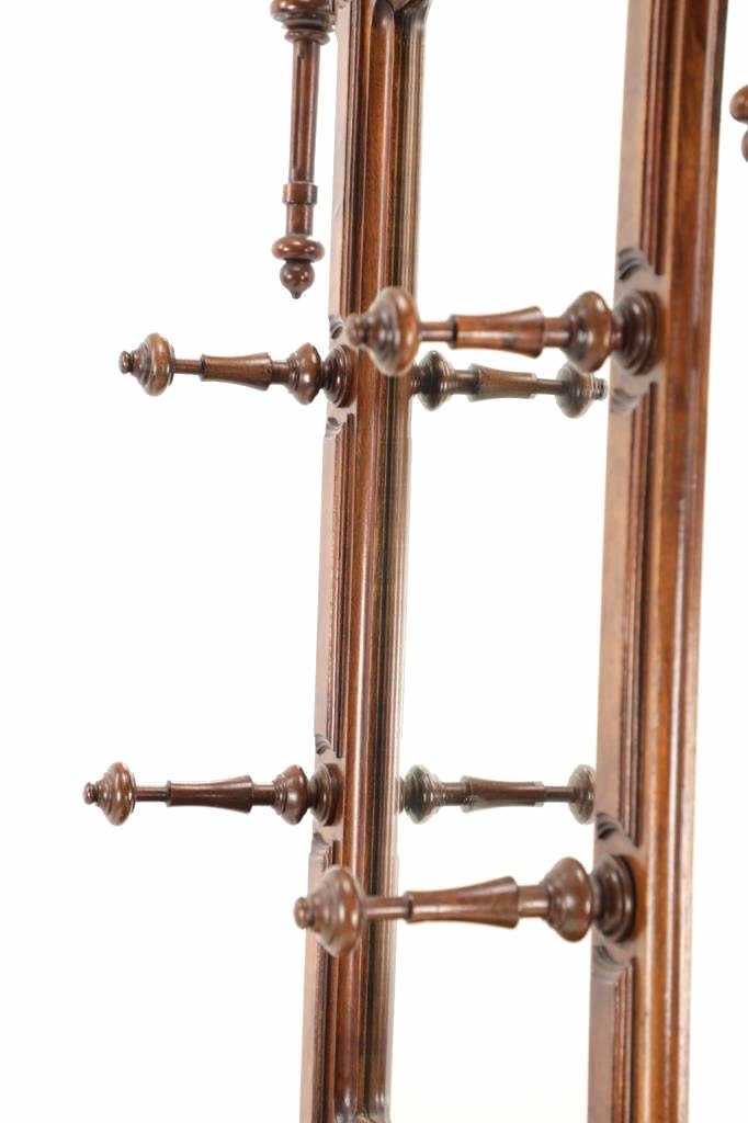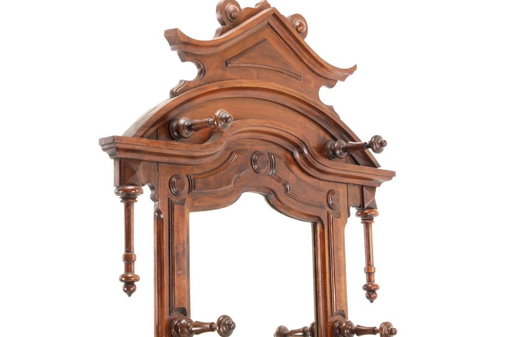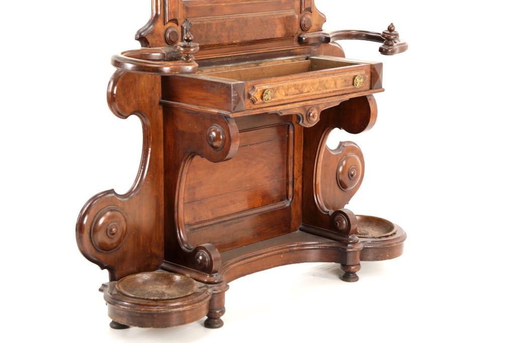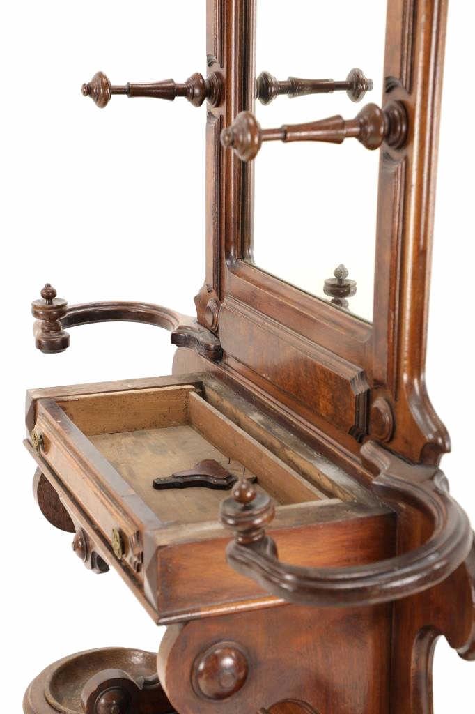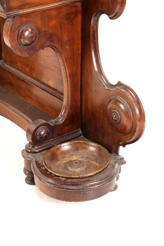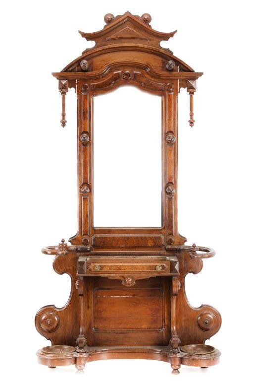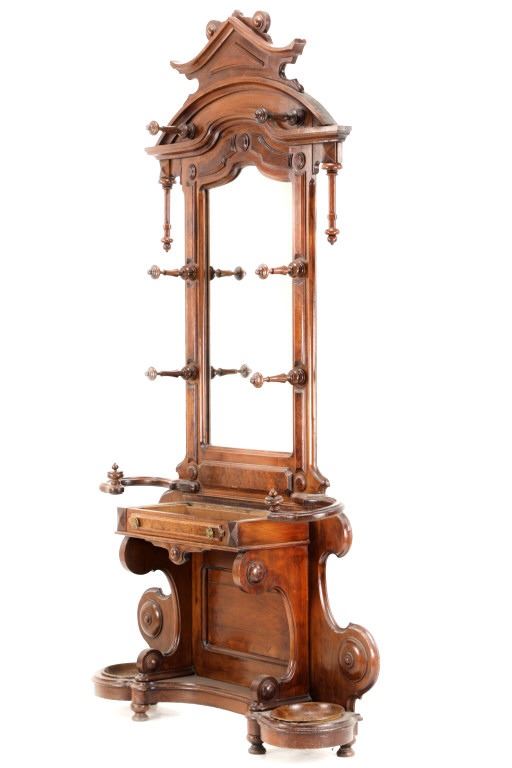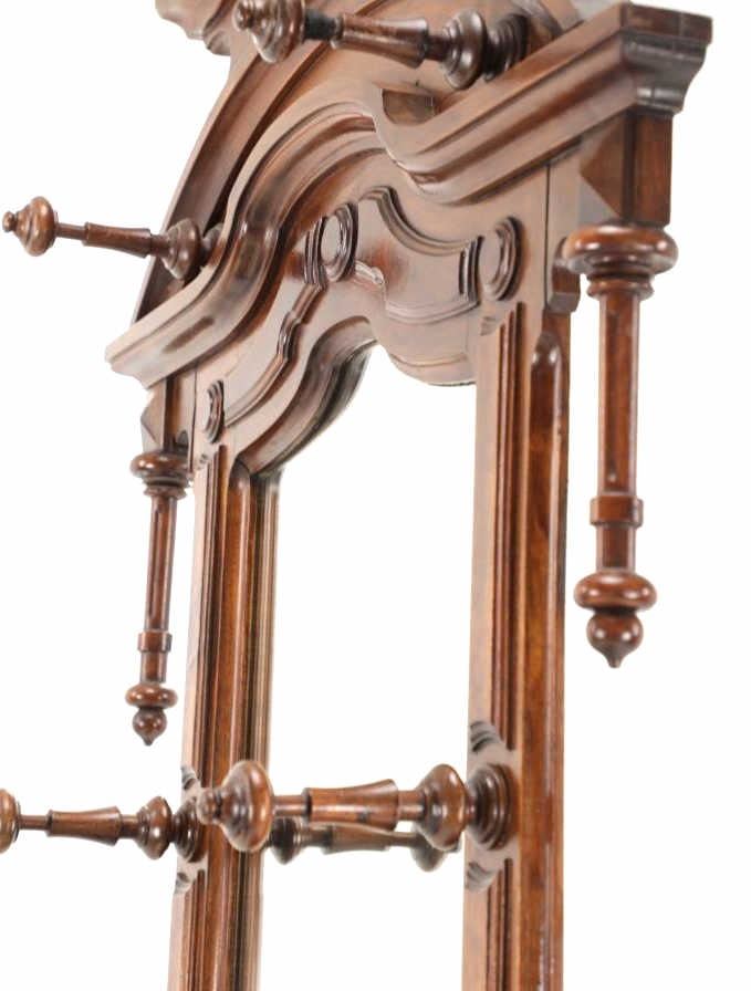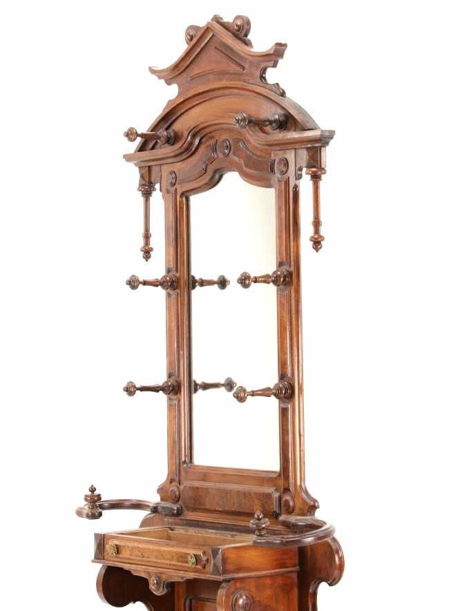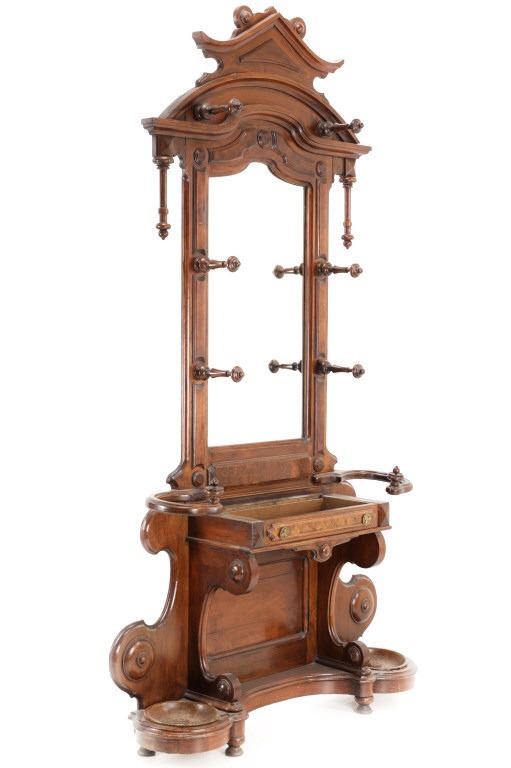 For your consideration is this 1860-1890 Rococo style hall tree. The hall tree shows a gorgeous walnut construction and features a large mirror in the center of the hall tree. Around the mirror it shows six large wood hooks for hanging coats and hats on. The crown is ornately carved with sloping edges. On the sides near the base, the hall tree has two metal drips pans and just above those, two umbrella style handles. In the middle next to the handles, the hall tree features one large drawer with a knob on each side. The marble top is missing, but can easily be replaced. Around the mirror and hangers, the front features burl veneers. Overall the hall tree shows good condition with some wear from its antique age and years of use, but no obvious signs of damage other than the missing marble top are present. The hall tree measures 88 1/2" tall by 47" wide and 12 1/2" deep.
