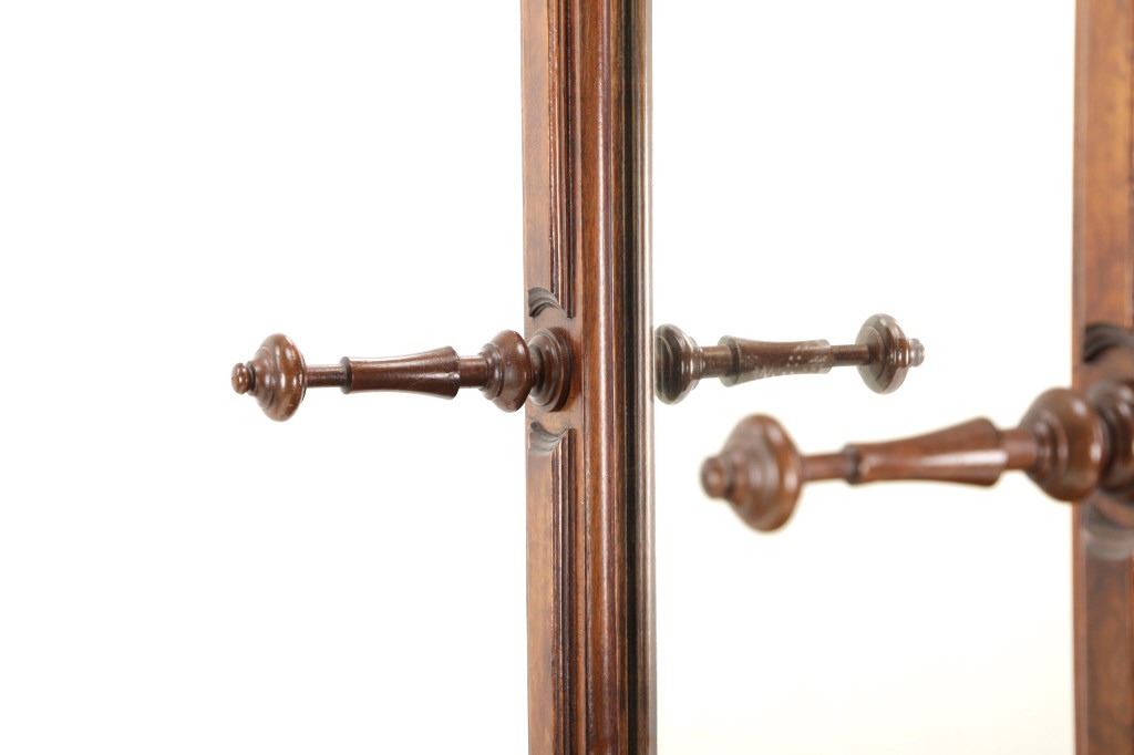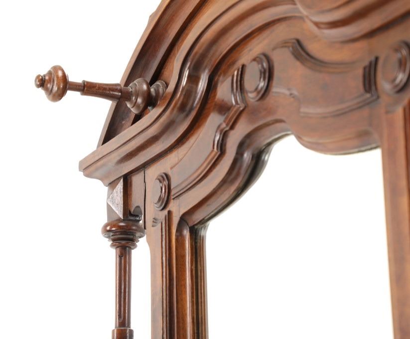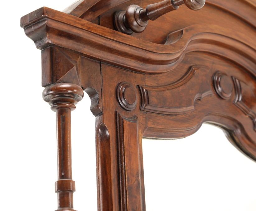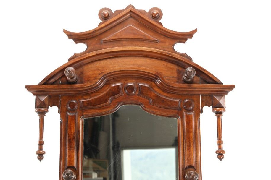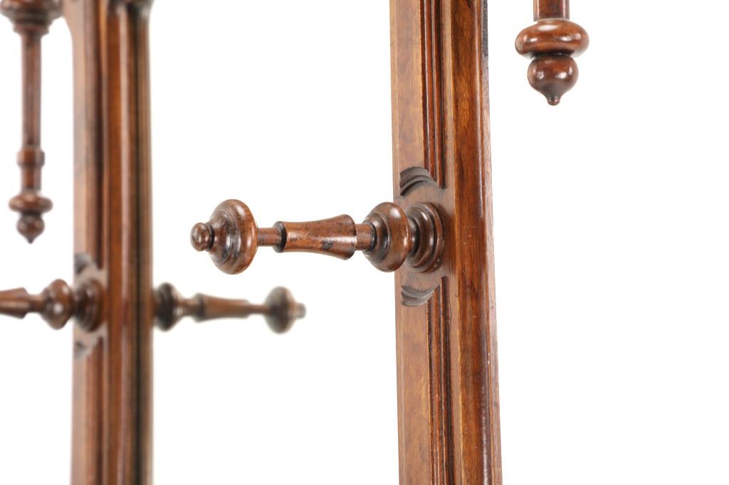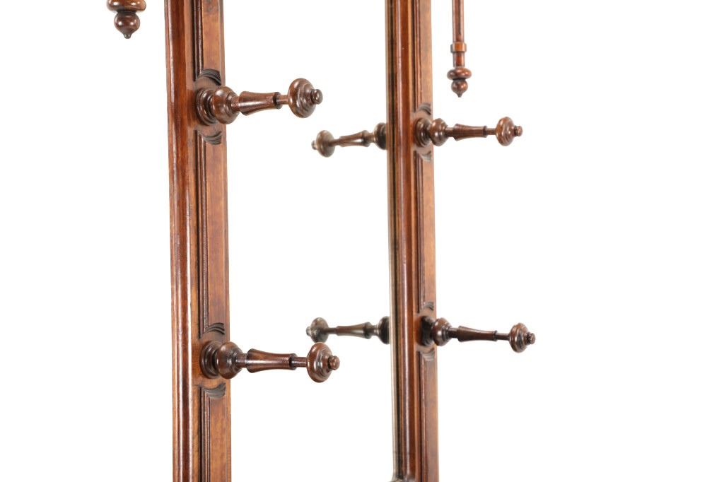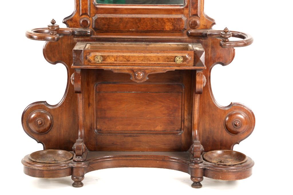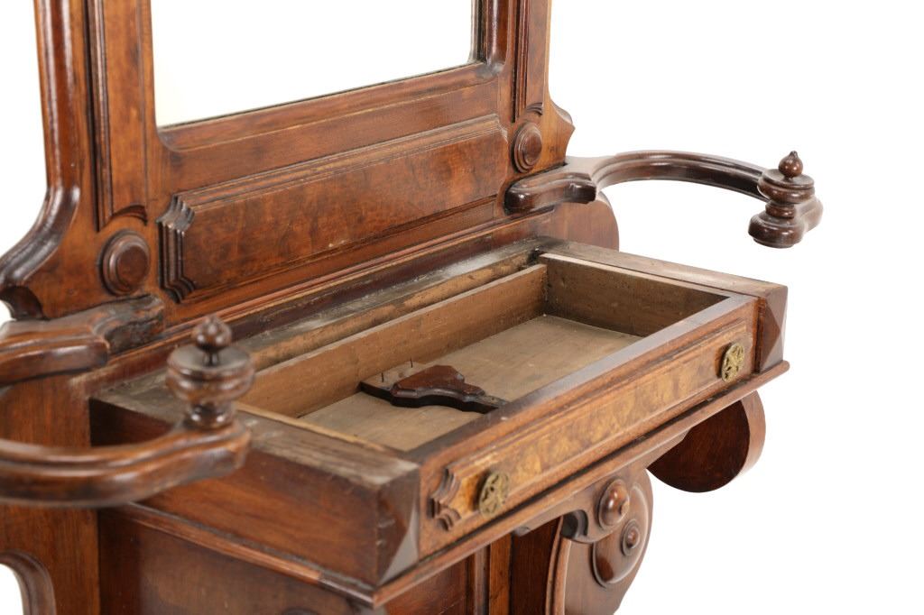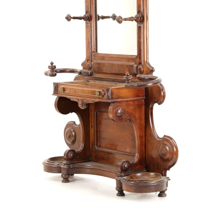For your consideration is this 1860-1890 Rococo style hall tree. The hall tree shows a gorgeous walnut construction and features a large mirror in the center of the hall tree. Around the mirror it shows six large wood hooks for hanging coats and hats on. The crown is ornately carved with sloping edges. On the sides near the base, the hall tree has two metal drips pans and just above those, two umbrella style handles. In the middle next to the handles, the hall tree features one large drawer with a knob on each side. The marble top is missing, but can easily be replaced. Around the mirror and hangers, the front features burl veneers. Overall the hall tree shows good condition with some wear from its antique age and years of use, but no obvious signs of damage other than the missing marble top are present. The hall tree measures 88 1/2" tall by 47" wide and 12 1/2" deep.