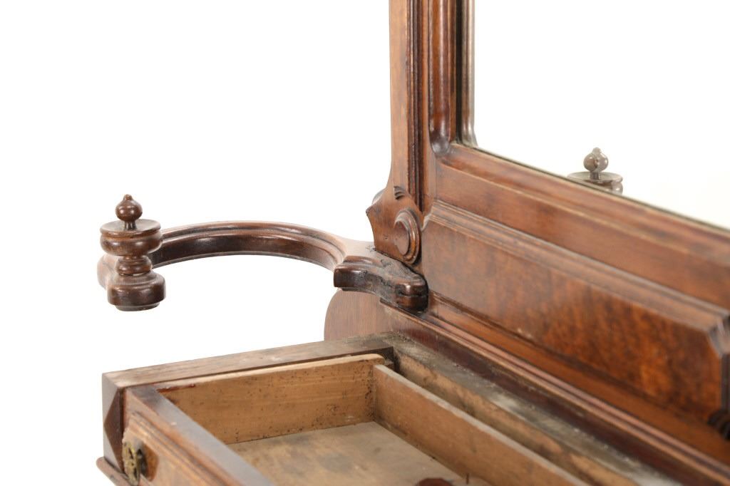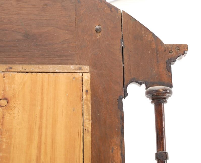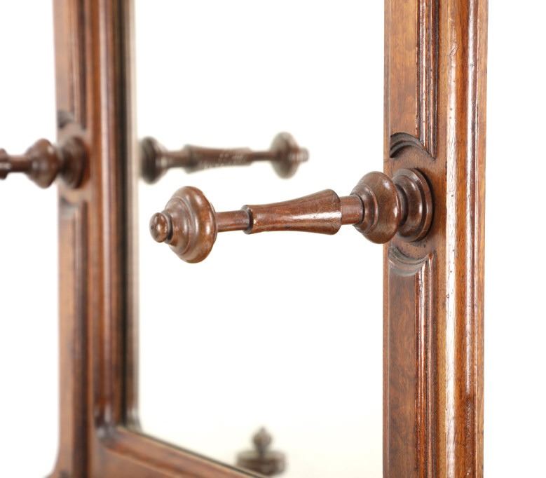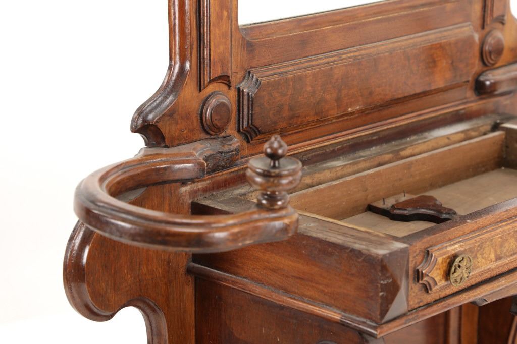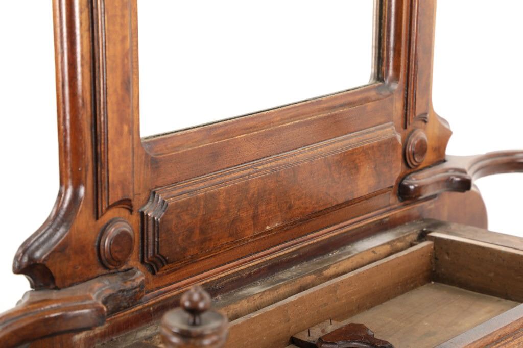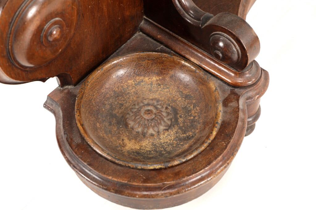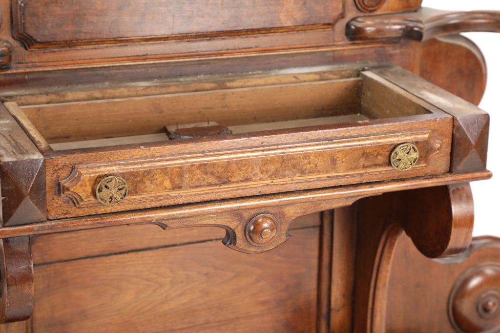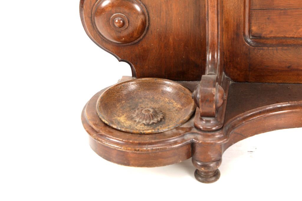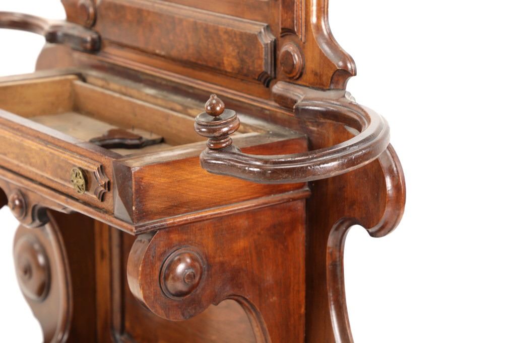 For your consideration is this 1860-1890 Rococo style hall tree. The hall tree shows a gorgeous walnut construction and features a large mirror in the center of the hall tree. Around the mirror it shows six large wood hooks for hanging coats and hats on. The crown is ornately carved with sloping edges. On the sides near the base, the hall tree has two metal drips pans and just above those, two umbrella style handles. In the middle next to the handles, the hall tree features one large drawer with a knob on each side. The marble top is missing, but can easily be replaced. Around the mirror and hangers, the front features burl veneers. Overall the hall tree shows good condition with some wear from its antique age and years of use, but no obvious signs of damage other than the missing marble top are present. The hall tree measures 88 1/2" tall by 47" wide and 12 1/2" deep.