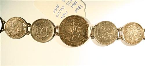Lovely hand crafted coin bracelet. Jewelled with 7 different coins of the World ranging from a large centre piece decreasing in size outward. Centre coin silver 1860 German Pfund linked to a 1927 Luxembourg 25 cent and 1861 Belgium 20 cent. Strung next with 1867 Belgium Franc and 1876 German Mark. The 2 end coins are 1875 German 10 Pfennigs, no return.