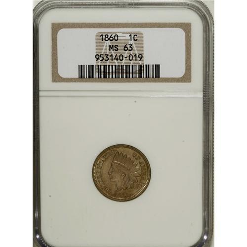 <B>1860 1C MS63 NGC.</B></I> NGC Census: (348/980). PCGS Population (246/534). Mintage: 20,566,000. Numismedia Wsl. Price for NGC/PCGS coin in MS63: $192. (#2058)<BR><BR><b>Shipping:</b> Coins & Currency (<a target="_blank" href="http://www.heritageauctions.com/common/shipping.php">view shipping information</a>)