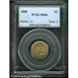 1860 1C MS64 PCGS. Pleasing golden-tan color occup <B>1860 1C MS64 PCGS.</B></I> Pleasing golden-tan color occupies lustrous surfaces that are devoid of any significant marks. The design features are well impressed. <BR><BR><B>Important notice:</B> Heritage usually auctions material at the rate of 200-250 lots per hour. On some occasions eBay Live bid software or the Internet may not be able to keep up with the pace of the auction. We recommend placing a realistic absentee bid now as insurance to avoid disappointment. Occasionally the auctioneer may eliminate or reject an eBay Live bid, and the auctioneer may also reopen a lot after the close of the eBay live bidding (usually because we missed an audience bid), and may reject your bid even if it shows you as the winning bidder. By bidding via eBay Live, you agree that Heritage may award the lot to another bidder at its sole discretion under the circumstances described above or any other reasonable circumstances. Since eBay bids are not shown to us until we open the lot on the floor, we treat those bids just like floor bids. In most cases the floor responds before the eBay bid is presented to us, due to Internet lag time, so for consistency we have made it a policy that floor bids are always considered first over tie eBay live bids. Also please note that all Heritage lots purchased through eBay Live carry a 20% Buyer's Premium. Please make sure you read the Terms and Conditions before you bid. This lot is being auctioned in conjunction with a live floor auction by Heritage Galleries & Auctioneers. All final auction and invoice information will be supplied by Heritage Galleries & Auctioneers, and all other information should be considered preliminary. Lot:5075