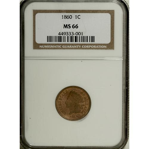 <B>1860 1C MS66 NGC.</B></I> A Rounded Bust representative with the new reverse, which sports an oak wreath and a shield at the top. The devices have solid definition, particularly on the reverse, and the shining surfaces are copper-orange with a splash of rouge. Well preserved with excellent eye appeal. Census: 35 in 66, 3 finer (4/07).<BR><BR><b>Shipping:</b> Coins & Currency (<a target="_blank" href="http://www.heritageauctions.com/common/shipping.php">view shipping information</a>)