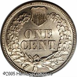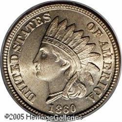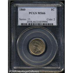 <B>1860 1C MS66 PCGS.</B></I> The Rounded Bust design of 1860 is actually a step backward design-wise with the hub being made from the master die from 1858. This is an impeccably smooth example with bright, even honey-tan coloration and striking details that are well brought up in all areas. A fleck of carbon in front of the chin is mentioned more for identification than as a distraction. Population: 31 in 66, 7 finer (1/05). Lot:5194