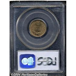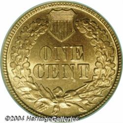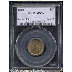 <B>1860<1C> MS66 PCGS.</B></I> Rounded bust variety. Lustrous with a good strike and copper-gold color that is accented with pastel-rose. Both sides are gloriously preserved with outstanding eye appeal. First year of the 'with shield' type. Population: 30 in 66, 7 finer (7/04). <BR><BR><B>Important notice:</B> Heritage usually auctions material at the rate of 200-250 lots per hour. On some occasions eBay Live bid software or the Internet may not be able to keep up with the pace of the auction. We recommend placing a realistic absentee bid now as insurance to avoid disappointment. Occasionally the auctioneer may eliminate or reject an eBay Live bid, and the auctioneer may also reopen a lot after the close of the eBay live bidding (usually because we missed an audience bid), and may reject your bid even if it shows you as the winning bidder. By bidding via eBay Live, you agree that Heritage may award the lot to another bidder at its sole discretion under the circumstances described above or any other reasonable circumstances. Since eBay bids are not shown to us until we open the lot on the floor, we treat those bids just like floor bids. In most cases the floor responds before the eBay bid is presented to us, due to Internet lag time, so for consistency we have made it a policy that floor bids are always considered first over tie eBay live bids. Also please note that all Heritage lots purchased through eBay Live carry a 20% Buyer's Premium. Please make sure you read the Terms and Conditions before you bid. </span></font></tr></table></td></tr></table>