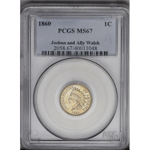 <B>1860<1C> MS67 PCGS.</B></I> Ex: Joshua and Ally Walsh. Aside from the Judd-228 transitional pattern, the 1860 cent introduced the familiar narrow shield and oak wreath reverse that identified the denomination for the next half century. The Indian cent proved to be the most enduring of Chief Engraver Longacre's many coinage designs, outlasting his Liberty double eagle by two years. This example is a dynamic, fully original Copper-Nickel Cent that has even honey-golden color over each side. The mint luster is radiant and undimmed by the passage of time. Identifiable by a single microscopic abrasion on the Indian's chin. An outstanding Copper-Nickel Cent and easily one of the finest known of the type as well as the date. Population: 7 in 67, none are finer at either service (4/06).