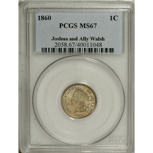 <B>1860 1C MS67 PCGS.</B></I> Ex: Joshua and Ally Walsh. Aside from the Judd-228 transitional pattern, the 1860 cent introduced the familiar narrow shield and oak wreath reverse that identified the denomination for the next half century. The Indian cent proved to be the most enduring of Chief Engraver Longacre's many coinage designs, outlasting his Liberty double eagle by two years. This example is a dynamic, fully original Copper-Nickel cent that has even, bright honey-golden color over each side. The mint luster is radiant and undimmed by the passage of time. Identifiable by a single microscopic abrasion on the Indian's chin. An outstanding Copper-Nickel cent and easily one of the finest known of the type as well as the date. Population: 7 in 67, none are finer at either service (3/07).<BR><BR><b>Shipping:</b> Coins & Currency (<a target="_blank" href="http://www.heritageauctions.com/common/shipping.php">view shipping information</a>)