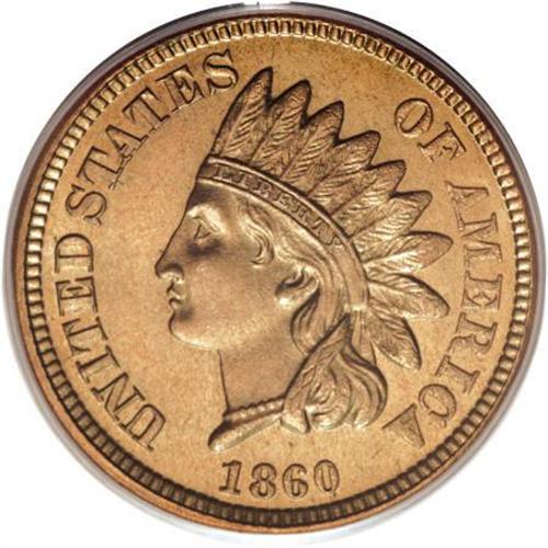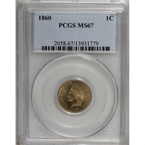 <B>1860 1C MS67 PCGS.</B></I> Type of 1860. Rounded Bust. This is the usually encountered design type for the year, and the variant normally used for type purposes. In Rick Snow's 1859-1869 <I>Attribution Guide </B></I>he gives sage advice about collecting on page 31: <BR> "When collecting an Indian Cent collection in any grade it is worthwhile to take your time and acquire really attractive coins. On the commoner dates this advice is easily overlooked in favor of just plugging a hole in an album as quickly as possible. If you collect with a little patience and an eye for quality, regardless of the grade, you'll eventually find a real pleasing example worthy of your collection."<BR> This piece is certainly worthy of the collector who has heeded Snow's advice to take time and acquire really attractive coins. This coin is unsurpassed for an 1860 in our experience. The surfaces are smooth and satiny with light, white-golden color. Each side is virtually mark-free as well as carbon-free. An interesting aspect of this particular piece is that it appears to have been struck from misaligned dies, with the right portion of each side displaying some weakness while the left parts are razor-sharp. Only 10 other pieces have been so graded by PCGS and NGC combined and none are finer (10/07).<BR><BR><B>Coin Engraver:</B> James B. Longacre<BR><BR><b>Shipping:</b> Coins & Currency (<a target="_blank" href="http://www.heritageauctions.com/common/shipping.php">view shipping information</a>)