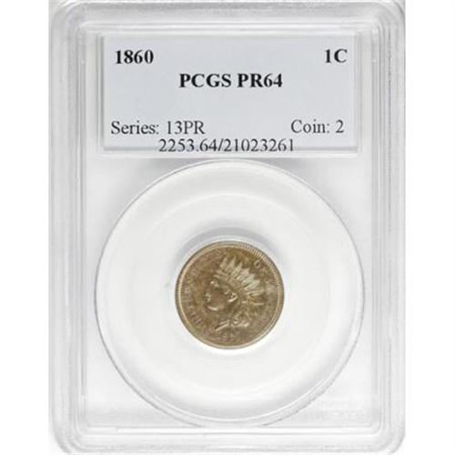 <B>1860 1C PR64 PCGS.</B></I> A sharply defined near-Gem proof with a few tiny spots. Both sides have pleasing proof surfaces with pale gold and light blue toning.<BR><BR><B>Coin Engraver:</B> James B. Longacre<BR><BR><b>Shipping:</b> Coins & Currency (<a target="_blank" href="http://www.heritageauctions.com/common/shipping.php">view shipping information</a>)