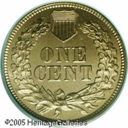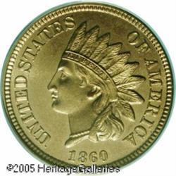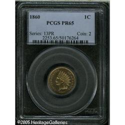 <B>1860 1C PR65 PCGS.</B></I> Rounded Bust. While the total mintage for proof 1860 cents was 542 coins, it is believed that not quite half (250) of that number were of the Type Two or Rounded Bust variety. It is also possible that since these pieces were produced later in the year than the Pointed Bust proofs, more may have been melted as unsold at year's end, further limiting the number of coins available to future generations of collectors. This is a beautiful example that has uniform honey-golden surfaces. The only defects we see on this high-end coin are a few scattered carbon spots at the center of the reverse, and a small abrasion under the D of UNITED in the obverse field. Population: 29 in 65, 5 finer (1/05). Lot:5270