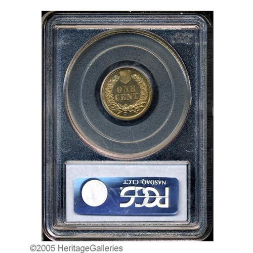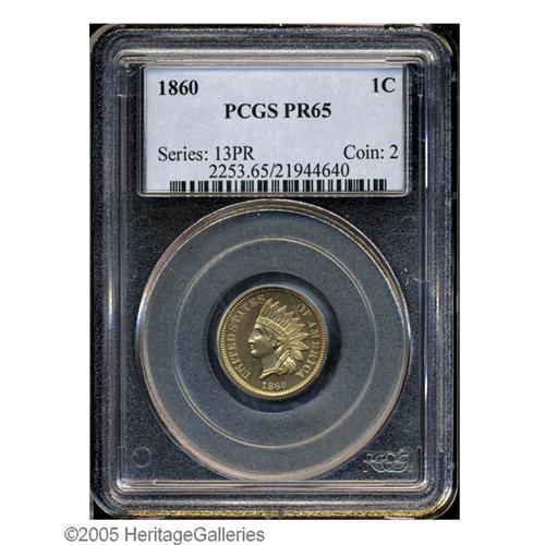 <B>1860<1C> PR65 PCGS.</B></I> This exquisitely struck and nearly unabraded Gem has reflective fields, and a hint of satin luster as well. A few tiny carbon flecks on the central reverse deny a higher grade. The <I>Guide Book</B></I> reports a mintage of 1,000 pieces, but a majority of this production was melted as unsold, and high grade survivors are rare. Population: 29 in 65, 5 finer (9/05).