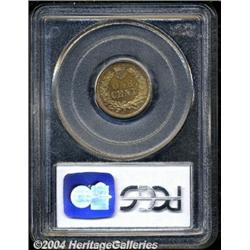 <B>1860<1C> PR65 PCGS.</B></I> First year of the Copper-Nickel Indian Cent design, and a very scarce issue in Gem and better grades. Unfathomably deep mirrors characterize the fields on this important high grade proof. Some contrasting mint frost can also be seen on the devices, giving the coin a mildly cameoed contrast. A significant overlay of natural patina covers each side of this bright honey-golden proof striking. Rose shades further enhance the obverse, blue-green color blankets the reverse. Population: 24 in 65, 4 finer (3/04). <BR><BR><B>Important notice:</B> Heritage usually auctions material at the rate of 200-250 lots per hour. On some occasions eBay Live bid software or the Internet may not be able to keep up with the pace of the auction. We recommend placing a realistic absentee bid now as insurance to avoid disappointment. Occasionally the auctioneer may eliminate or reject an eBay Live bid, and the auctioneer may also reopen a lot after the close of the eBay live bidding (usually because we missed an audience bid), and may reject your bid even if it shows you as the winning bidder. By bidding via eBay Live, you agree that Heritage may award the lot to another bidder at its sole discretion under the circumstances described above or any other reasonable circumstances. Since eBay bids are not shown to us until we open the lot on the floor, we treat those bids just like floor bids. In most cases the floor responds before the eBay bid is presented to us, due to Internet lag time, so for consistency we have made it a policy that floor bids are always considered first over tie eBay live bids. Also please note that all Heritage lots purchased through eBay Live carry a 20% Buyer's Premium. Please make sure you read the Terms and Conditions before you bid.
