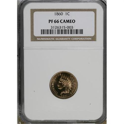 <B>1860 1C PR66 Cameo NGC.</B></I> 1860 proof cents are scarcer than their 1,000-piece mintage might suggest, as 450 or so were either melted or released into circulation due to poor sales (Richard Snow, 2006). This Premium Gem Cameo exhibits a better-than-average strike with pleasing golden-tan surfaces. A few light flecks are noted on reach side. Census: 1 in 66 Cameo, 0 finer (3/08).<BR><BR><b>Shipping:</b> Coins & Currency (<a target="_blank" href="http://www.heritageauctions.com/common/shipping.php">view shipping information</a>)