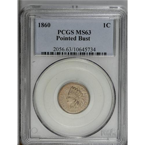 <B>1860<1C> Pointed Bust MS63 PCGS.</B></I> A Select and pleasing example of this early "white cent," of the scarcer variety for the year. Nicely detailed and lustrous with salmon-orange patina. A small carbon spot is noted at the Indian's throat.