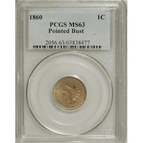 <B>1860 1C Pointed Bust MS63 PCGS.</B></I> PCGS Population (39/86). NGC Census: (0/0). (#2056)<BR><BR><B>Coin Engraver:</B> James B. Longacre<BR><BR><b>Shipping:</b> Coins & Currency (<a target="_blank" href="http://www.heritageauctions.com/common/shipping.php">view shipping information</a>)
