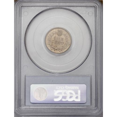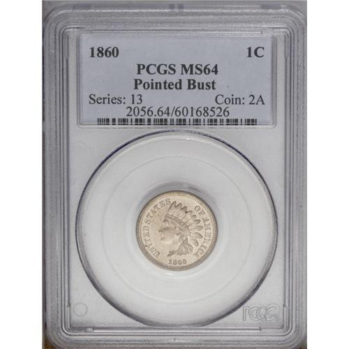 <B>1860<1C> Pointed Bust MS64 PCGS.</B></I> The Pointed Bust is difficult to obtain in the better Mint State grades. This near-Gem displays luminous tan-white surfaces with sharply struck motifs; all four diamonds are clear, though some of the feather tips are soft. A couple of miniscule contact marks are visible on the Indian's cheek and neck, and three or four greenish flecks are noted on the reverse. Population: 39 in 64, 28 finer (2/06).