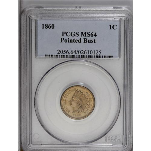 <B>1860<1C> Pointed Bust MS64 PCGS.</B></I> The more scarce variety, with generally well-kept surfaces and attractive pale orange patina. A few small marks preclude Gem status.