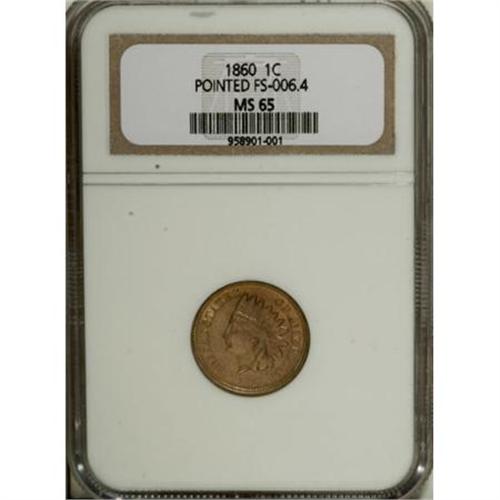 <B>1860 1C Pointed Bust MS65 NGC.</B></I> FS-006.4. The Pointed Bust variety is considered highly desirable, and this example is lovely. It is sharply struck with highly lustrous golden surfaces.<BR><BR><B>Coin Engraver:</B> James B. Longacre<BR><BR><b>Shipping:</b> Coins & Currency (<a target="_blank" href="http://www.heritageauctions.com/common/shipping.php">view shipping information</a>)