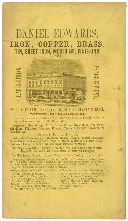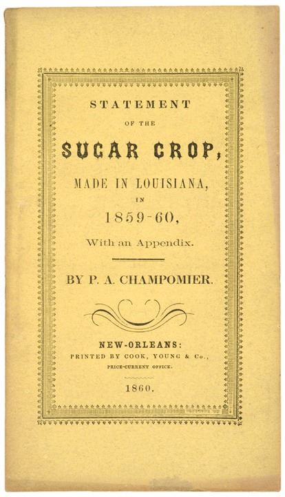 This original 19th Century treatise was written by Pierre (P.A.) Champomier and printed in New Orleans by Cook, Young & Co. Informative work provides invaluable insight into the agricultural dynamics of the slave era in Louisiana. Sugar cane was labor intensive and large numbers of slaves were employed to do the work. The crushed cane was used for fuel, molasses and as a base for rum, and the industry grew rapidly. By 1830, New Orleans had the largest sugar refinery in the world. Additionally, this text is considered an historically important pre-Civil War source, as it furnishes detailed coverage of individual plantations rather than simply parish-wide aggregate figures.