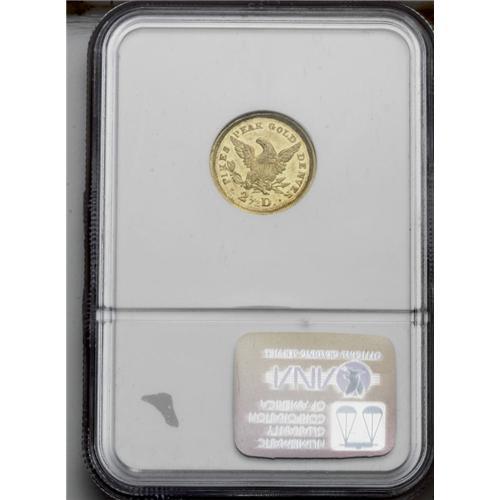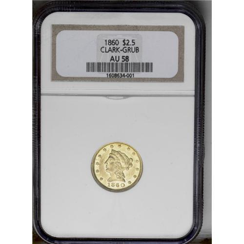<B>1860<$2 1/2> Clark, Gruber & Co. Quarter Eagle AU58 NGC.</B></I> K-1, R.4. This pleasing piece features substantial glimmering luster, which is only diminished across the open fields and on the cheek of the high relief portrait. CLARK & CO and the eagle's shield are somewhat soft, as usual for the Federal-imitative type. Census: 7 in 58, 12 finer (5/06). Listed on page 362 of the 2007 <I>Guide Book.</B></I><BR><I>From The Long Beach Family Collection.</B></I>