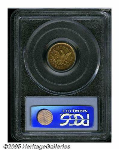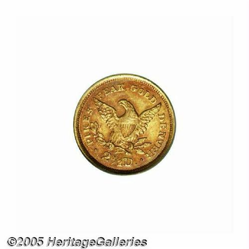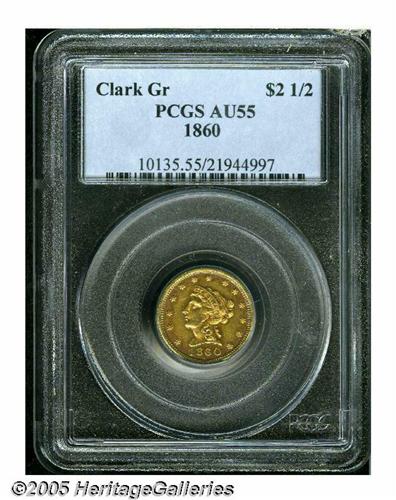 <B>1860<$2 1/2> Clark, Gruber & Co. Quarter Eagle AU55 PCGS.</B></I> K-1, R.4. Ruby-red and electric-blue colors dominate the margins, while orange hues embrace the fields and cheek. The stars are well struck, although the centers are not fully brought up by the dies. A few small marks on the portrait are of little relevance. The issues of Clark, Gruber, & Co. were highly regarded by Colorado banking circles. Listed on page 309 of the 2005 <I>Guide Book.</B></I><BR><I>From The Great Western Collection of Territorial Gold.</B></I>