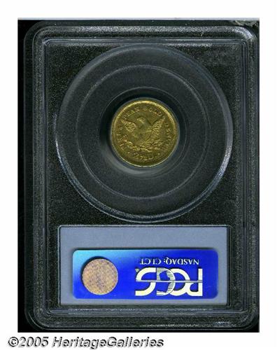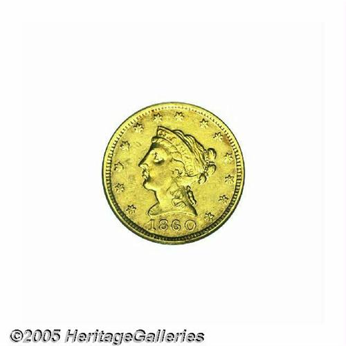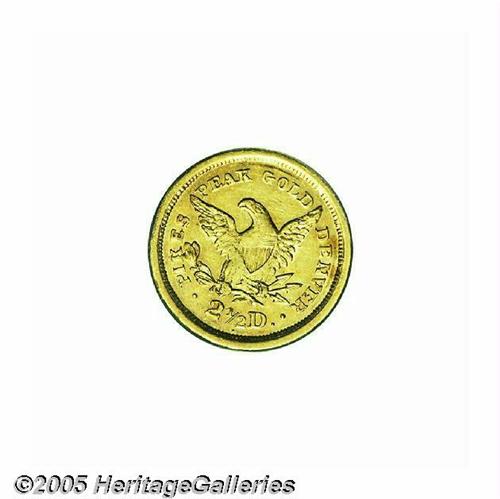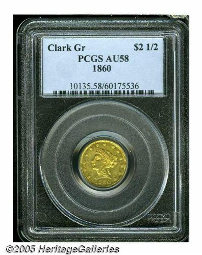 <B>1860<$2 1/2> Clark, Gruber & Co. Quarter Eagle AU58 PCGS.</B></I> K-1, R.4. A volcano-shaped incarnation of Pike's Peak was depicted on the 1860 Ten and Twenty Dollar pieces. The Clark, Gruber & Co. Quarter Eagle and Half Eagle, on the other hand, imitated their respective Federal denominations. Somewhat softly struck in the centers, the remainder of the design is crisp, and no friction is detected on the fully rounded cheek. Moderate marks near the jaw and stars 2 through 4 do not limit the grade. Listed on page 309 of the 2005 <I>Guide Book.</B></I><BR><I>From The Great Western Collection of Territorial Gold.</B></I>