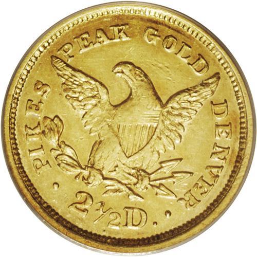 <B>1860 $2 1/2  Clark, Gruber & Co. Quarter Eagle MS61 PCGS.</B></I> K-1, R.4. The issues of Clark, Gruber, & Co. were highly respected by Colorado banking circles, and received little competition from other private miners. Other Colorado firms, John Parsons and J.J. Conway, produced private gold coins, but their emissions must have been small, since these are great rarities today. Typically, the coins of Clark, Gruber & Co. imitated their Federal counterparts, as is the case for Kagin-1. CLARK & CO. substitutes LIBERTY on the coronet, and PIKES PEAK GOLD DENVER replaces UNITED STATES OF AMERICA; these changes evade counterfeiting laws. The present honey-gold piece is softly struck in the centers, but elements near the borders are bold, and handling marks are relegated to the left obverse field, and the field above the eagle. Listed on page 362 of the 2006 <I>Guide Book.</B></I>
