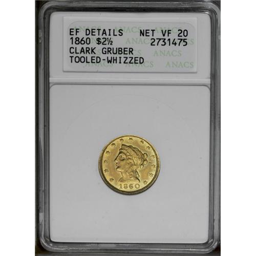 <B>1860<$2 1/2> Clark, Gruber & Co. Quarter Eagle--Tooled, Whizzed--ANACS. XF Details, Net VF20.</B></I> K-1, R.4. Obvious smoothing is seen in the obverse fields, a crude attempt to remove a series of scratches. Both sides have also been harshly cleaned. Still, a noteworthy example of this popular Territorial gold coin minted at this private mint in Denver, Colorado. Well detailed, save for diagnostic softness at the central regions.<BR><I>From The Carolina Gold Collection, Part Four.</B></I>