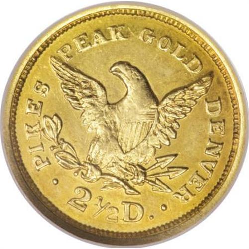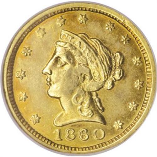 <B>1860 $2 1/2 Clark, Gruber & Co. Quarter Eagle MS63 NGC.</B></I> K-1, R.4. A regal specimen of this elusive issue, with delicate coppery-gold hues around the periphery, while the centers remain bright gold. The engraver manually punched the devices into the opposing dies, so very few are found fully struck. On this particular coin, the curls on Liberty are decent, but around her ear the usual softness is present. Most of the stars are crisp although the fifth and sixth stars lack the central radial lines. Turning to the reverse, the eagle's neck, right wing and top left of the shield are poorly defined, while the balance of the reverse is sharp. Identifiable by a small nick on the obverse rim past the eighth star. In terms of scarcity, this is a conditionally rare item, with a total of 9 examples graded at MS63 by NGC and PCGS combined, and just three coins graded finer (all three by NGC), as of (1/08).<BR> From nearly perfect dies, a faint die crack is noted through GOLD. The initial Clark, Gruber & Co. gold pieces bore Federal-inspired designs, with the famous exception of the 'volcanic' Pike's Peak on the ten and twenty dollar denominations. Listed on page 366 of the 2008 <I>Guide Book. </B></I><BR><BR><b>Shipping:</b> Coins & Currency (<a target="_blank" href="http://www.heritageauctions.com/common/shipping.php">view shipping information</a>)