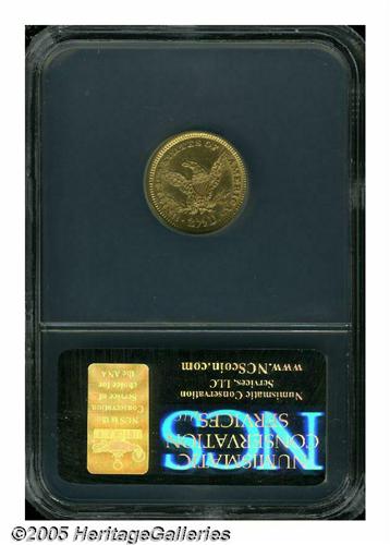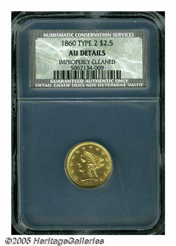 <B>1860<$2 1/2> New Reverse, Type Two AU Details, Improperly Cleaned, NCS.</B></I> Scarce in all grades, and rare in Mint State, as befits the low mintage of 22,563 business strikes. Bright surfaces display yellow-gold patina and traces of luster in the protected areas. Wispy hairlines are scattered about, as are some minute contact marks. Still, a nice looking coin.