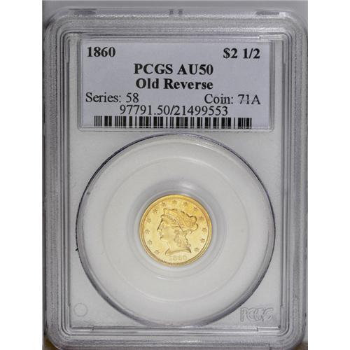 1860 $2 1/2 Old Reverse, Type One AU50 PCGS. The 1860