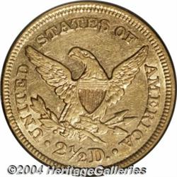 <table><tr><td><table><tr><td>1860 $2 1/2 Old Reverse, Type One AU50 PCGS. Reported to exist but not officially discovered until late 1990. The Type One reverse, also known on C-mint and S-mint quarter eagles of the same year, has slightly smaller letters in the reverse legend and the lowest arrowhead almost touches CA in AMERICA. Ample bright luster and no individually obtrusive abrasions confirm the AU grade. The obverse is well struck, while the reverse has typical definition on the eagle's leg, neck, and claws. Population: 1 in 50, 7 finer (3/04). <BR><BR><B>Important notice:</B> Heritage usually auctions material at the rate of 200-250 lots per hour. On some occasions eBay Live bid software or the Internet may not be able to keep up with the pace of the auction. We recommend placing a realistic absentee bid now as insurance to avoid disappointment. Occasionally the auctioneer may eliminate or reject an eBay Live bid, and the auctioneer may also reopen a lot after the close of the eBay live bidding (usually because we missed an audience bid), and may reject your bid even if it shows you as the winning bidder. By bidding via eBay Live, you agree that Heritage may award the lot to another bidder at its sole discretion under the circumstances described above or any other reasonable circumstances. Since eBay bids are not shown to us until we open the lot on the floor, we treat those bids just like floor bids. In most cases the floor responds before the eBay bid is presented to us, due to Internet lag time, so for consistency we have made it a policy that floor bids are always considered first over tie eBay live bids. Also please note that all Heritage lots purchased through eBay Live carry a 20% Buyer's Premium. Please make sure you read the Terms and Conditions before you bid. <BR><BR><B>IMPORTANT ANNOUNCEMENT ABOUT RESERVES:</B> Heritage now divulges all reserves on its web site 7 days before every auction. If you want to know whether the reserve on this lot has been met, and if not, what the reserve amount is, please visit this lot page on the HeritageCoin.com web site, or email: bid@HeritageGalleries.com </span></font></td></tr></table></td></tr></table>