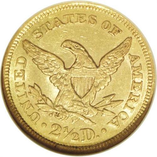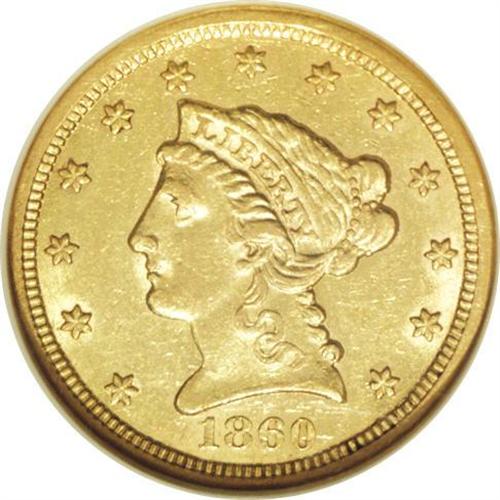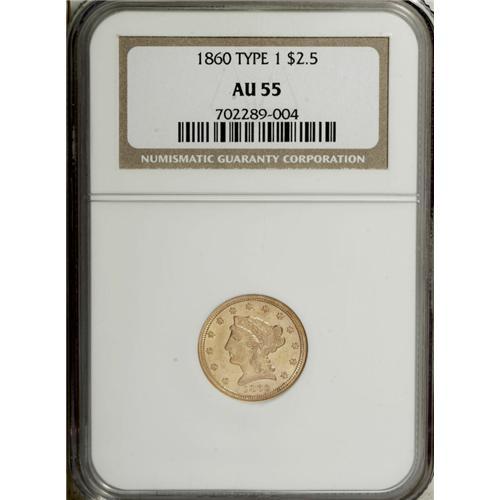 1860 $2 1/2 Old Reverse, Type One AU55 NGC. In 1859, a