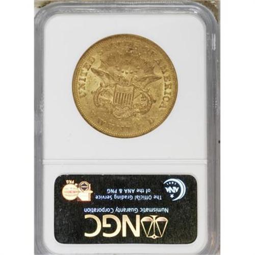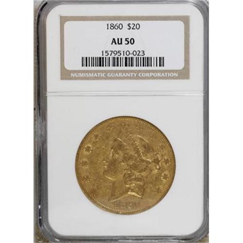 <B>1860 $20 AU50 NGC.</B></I> The successful bidder of this lot will own an 1860 twenty that grades finer than the best example in the Smithsonian Institution, believe it or not. Obviously, this issue is available in AU and Mint State, but finding a nice original piece, such as the coin in this lot, can be a challenge. Brass-gold toning and limited distractions account for the eye appeal of this example. A respectable amount of luster shows under the patina.<BR><BR><B>Coin Engraver:</B> James B. Longacre<BR><BR><b>Shipping:</b> Coins & Currency (<a target="_blank" href="http://www.heritageauctions.com/common/shipping.php">view shipping information</a>)