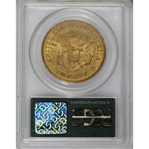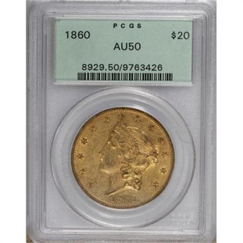 <B>1860 $20 AU50 PCGS.</B></I> This original canary-gold Liberty twenty has the luster extent of a higher grade, and the sharpness is also pleasing. A thin vertical mark is noted on the right reverse field. Encapsulated in a green label holder.<BR><BR><b>Shipping:</b> Coins & Currency (<a target="_blank" href="http://www.heritageauctions.com/common/shipping.php">view shipping information</a>)
