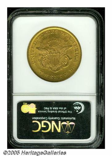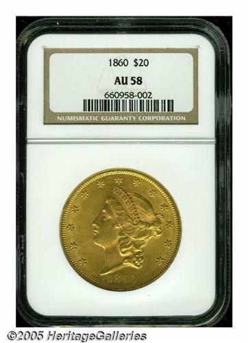<B>1860<$20> AU58 NGC.</B></I> An tough issue in higher grades, this example sports lovely dark-golden surfaces, with light wear but few notable distractions and a good deal of Mint luster.