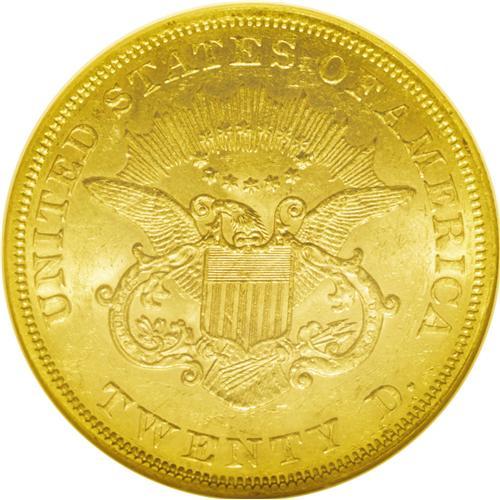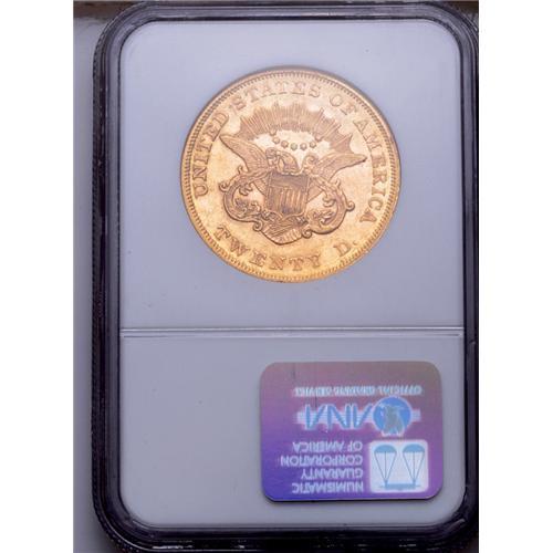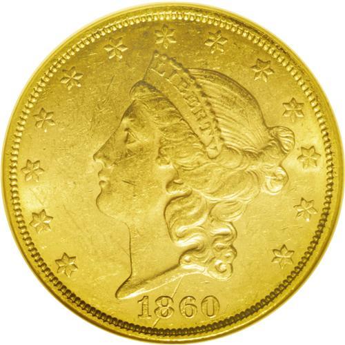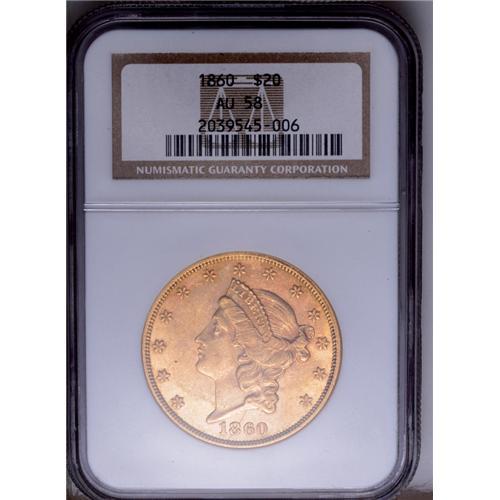 <B>1860<$20> AU58 NGC.</B></I> Perhaps it is because examples are easily located in VF and XF grades that this date is considered common, but it is hardly easy to locate in attractive AU or finer grades, although several higher grade pieces made a recent appearance from the treasure of the <I>S.S. Republic.</B></I> There is no record of significant varieties for this date, although differences in the date position have been identified. For example, two different specimens in The Wyoming Collection have the dates in different positions relative to the bust and border. This example could best be described as a High Date variety with much less space between the top of the digit 1 and the bust truncation, and considerably more space between the bottom of the date and the border.<BR> This example has a curious depression from the border to the neck truncation, through the bottom loop and upper right curve of the digit 8 in the date. This depression or trough appears to be a minor "struck-through" error, similar to a lint mark but much heavier. Both sides exhibit frosty mint luster with only a trace of wear. The surfaces have lovely yellow-gold color with considerable rose toning. The surfaces have light abrasions as usual for the early double eagles.<BR><I>From The Wyoming Collection.</B></I>