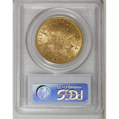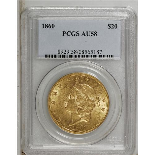 1860 $20 AU58 PCGS. Highly appealing despite numerous