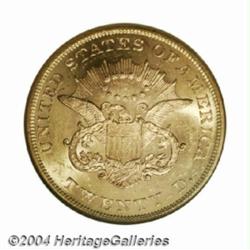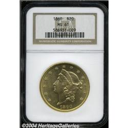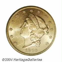 <table><tbody><tr><td><table> <TR><TD width="100%"><TABLE cellSpacing=1 cellPadding=3 width="100%" border=0><TBODY><TR><TD width="100%" bgColor=#79735c><FONT face=arial color=#ffffff size=3><B>Description</B> </FONT></TD></TR><TR><TD width="100%" bgColor=#ffffff><FONT face=arial size=2><B>1860 $20 MS61 NGC.</B></I> Well struck and highly lustrous, with frosty orange-gold surfaces that display exciting cartwheel luster. There are numerous small abrasions on each side, along with a few moderate blemishes. A moderately scarce P-mint Double Eagle that leaps in difficulty at the Mint State level. Population: 24 in 61, 11 finer (11/03).<BR><I>From a Magnificent Collection of Double Eagles.</B></I> </FONT></TD></TR></TBODY></TABLE></TD></TR></TBODY></TABLE><BR><A name=PricesRealized></A><TABLE cellSpacing=0 cellPadding=0 width="100%" bgColor=#000000 border=0><TBODY><TR><TD width="100%"><TABLE cellSpacing=1 cellPadding=3 width="100%" border=0><TBODY><TR><TD width="100%" bgColor=#79735c><A name=PR><FONT face=arial color=#ffffff size=3><B>Previous Prices from Heritage Auctions</B> </FONT></A></TD></TR><TR><TD bgColor=#f6f6ed><TABLE cellSpacing=0 cellPadding=0 width="100%" border=1><TBODY><TR><TD align=middle width="33%"><B>Date</B></TD><TD align=middle width="33%"><B>Service</B></TD><TD align=middle width="33%"><B>Price</B></TD></TR><TR bgColor=whitesmoke><TD width="33%"><B>05/31/2003</B></TD><TD width="33%">NGC</TD><TD width="33%">$3,795.00</TD></TR><TR bgColor=whitesmoke><TD width="33%"><B>10/06/2001</B></TD><TD width="33%">NGC</TD><TD width="33%">$3,220.00</TD></TR><TR bgColor=whitesmoke><TD width="33%"><B>10/01/2001</B></TD><TD width="33%">NGC</TD><TD width="33%">$2,990.00</TD></TR><TR bgColor=whitesmoke><TD width="33%"><B>10/01/1999</B></TD><TD width="33%">PCGS</TD><TD width="33%">$4,370.00</TD></TR></TBODY></TABLE></TD></TR><TR><TD bgColor=#ffffff><FONT face=arial size=1 ?>PLEASE NOTE: All prices realized reflect the final hammer price PLUS the buyer's premium in auctions that charge a buyer's premium. Each item has a notation at the top of the listing indicating whether that lot included a buyer's premium. Example: A item that sells with a final hammer price of $100 and a 20% buyer's premium will display with a price realized of $120. All information listed is intended to be as accurate as possible, but errors are possible. Please use this guide carefully and inform us of any inaccuracies. </FONT></TD></TR></TBODY></TABLE></TD></TR></TBODY></TABLE><BR><TABLE cellSpacing=0 cellPadding=0 width="100%" bgColor=#000000 border=0><TBODY><TR><TD width="100%"><TABLE cellSpacing=1 cellPadding=3 width="100%" border=0><TBODY><TR><TD width="100%" bgColor=#79735c colSpan=6><FONT face=arial color=#ffffff size=3><B>Price Guide*</B> </FONT></TD></TR><TR bgColor=#f6f6ed><TD align=middle><B>Grade</B> </TD><TD align=middle><B>Coin World<BR>(Trends)</B> </TD><TD align=middle><B>Numismedia<BR>Retail</B> </TD><TD align=middle><B>Numismedia<BR>Wholesale</B> </TD><TD align=middle><B>Coin<BR>Universe</B> </TD><TD align=middle><B>Heritage<BR>Value Index</B> </TD></TR><TR bgColor=#ffffff><TD align=middle>60</TD><TD align=right>$4,000.00</TD><TD align=right>---</TD><TD align=right>$3,100.00</TD><TD align=right>$3,975.00</TD><TD align=right>$2,799.90</TD></TR><TR style="FONT-WEIGHT: bold" bgColor=#cccfdd><TD align=middle>61</TD><TD align=right>---</TD><TD align=right>---</TD><TD align=right>$3,850.00</TD><TD align=right>$5,200.00</TD><TD align=right>$4,375.11</TD></TR><TR bgColor=#ffffff><TD align=middle>62</TD><TD align=right>$10,000.00</TD><TD align=right>---</TD><TD align=right>$7,750.00</TD><TD align=right>---</TD><TD align=right>$6,425.00</TD></TR><TR bgColor=#ffffff><TD colSpan=6><FONT size=1>*All information listed is intended to be as accurate as possible, but errors are possible. No item may be returned or refused based on this information which is provided as a service to our customers. You should contact each pricing source directly to determine the accuracy of this information. </FONT></TD></TR></TBODY></TABLE></TD></TR></TBODY></TABLE><BR><TABLE cellSpacing=0 cellPadding=0 width="100%" bgColor=#000000 border=0><TBODY><TR><TD width="100%"><TABLE cellSpacing=1 cellPadding=3 width="100%" border=0><TBODY><TR><TD width="100%" bgColor=#79735c><FONT face=arial color=#ffffff size=3><B>Population Guide</B> </FONT></TD></TR><TR bgColor=#ffffff><TD align=middle><!-- Begin Output of Population Grid--><TABLE cellSpacing=0 cellPadding=0 width="100%" border=0><TBODY><TR><TD vAlign=center><TABLE cellSpacing=0 width="100%" border=1 cellsadding="3"><TBODY><TR><TD vAlign=center><TABLE cellSpacing=0 cellPadding=3 width="100%" border=1><TBODY><TR><TD vAlign=center align=middle bgColor=#f0f1e8 colSpan=2 <CENTER><FONT face=Arial size=2><B>PCGS Pop </B></FONT><CENTER></CENTER></TD><TD vAlign=center align=middle bgColor=#f0f1e8 colSpan=2><CENTER><FONT face=Arial size=2><B>NGC Pop</B></CENTER></FONT></TD></TR><TR><TD vAlign=center><FONT face=Arial size=2>(61)</FONT> </TD><TD vAlign=center align=right><FONT face=Arial size=2>15</FONT> </TD><TD vAlign=center><FONT face=Arial size=2>(61)</FONT> </TD><TD vAlign=center align=right><FONT face=Arial size=2>24</FONT> </TD></TR><TR><TD vAlign=center><FONT face=Arial size=2>(>61)</FONT> </TD><TD vAlign=center align=right><FONT face=Arial size=2>10</FONT> </TD><TD vAlign=center><FONT face=Arial size=2>(>61)</FONT> </TD><TD vAlign=center align=right><FONT face=Arial size=2>11</FONT> </TD></TR></TBODY></TABLE></TD></TR></TBODY></TABLE></TD></TR></TBODY></TABLE><!-- End Output of Population Grid--></TD></TR></TBODY></TABLE></TD></TR></TBODY></TABLE><BR><TABLE cellSpacing=0 cellPadding=0 width="100%" bgColor=#000000 border=0><TBODY><TR> <font color='#000000'><span style='background-color: #FFFFFF'><td bgcolor='#FFFFFE'> Important notice: Heritage usually auctions material at the rate of 200-250 lots per hour. On some occasions eBay Live bid software or the Internet may not be able to keep up with 