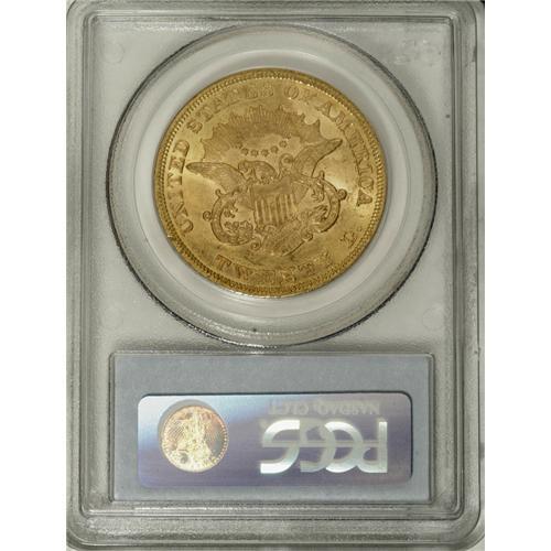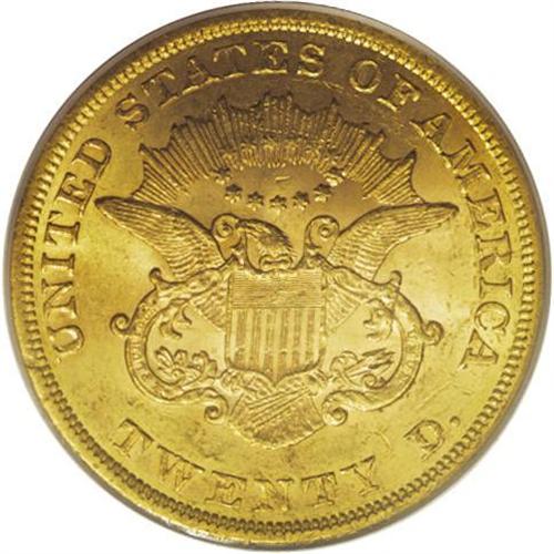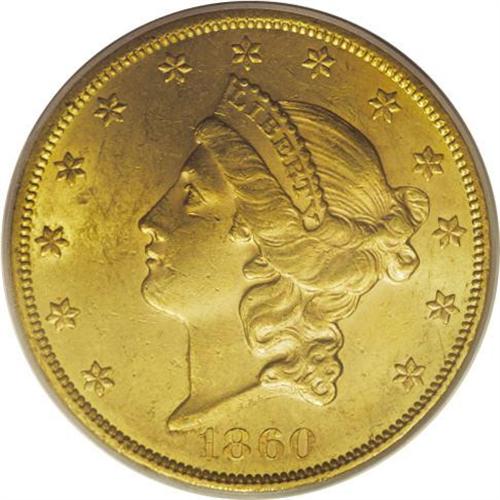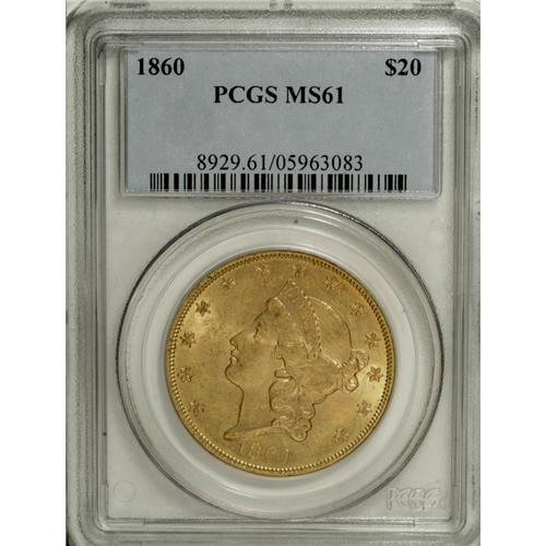 <B>1860 $20 MS61 PCGS.</B></I> 1860 double eagles are quite plentiful in circulated grades, but become scarce in Mint State. Peach-gold surfaces on the MS61 specimen being offered in this sale are laced with wisps of mint green and accented with traces of light tan, and a relatively strong strike characterizes most of the design elements. The surfaces reveal soft luster and a scattering of contact marks, especially on the obverse. Population: 20 in 61, 14 finer (2/07).<BR><BR><b>Shipping:</b> Coins & Currency (<a target="_blank" href="http://www.heritageauctions.com/common/shipping.php">view shipping information</a>)