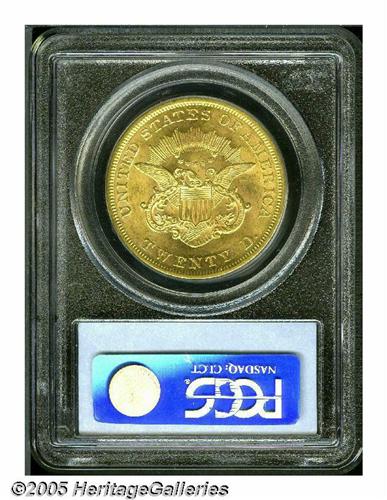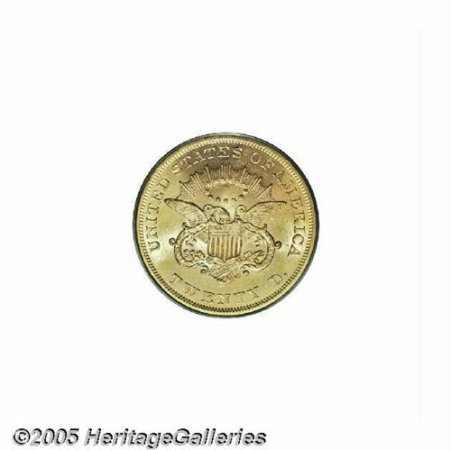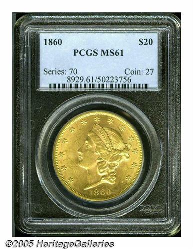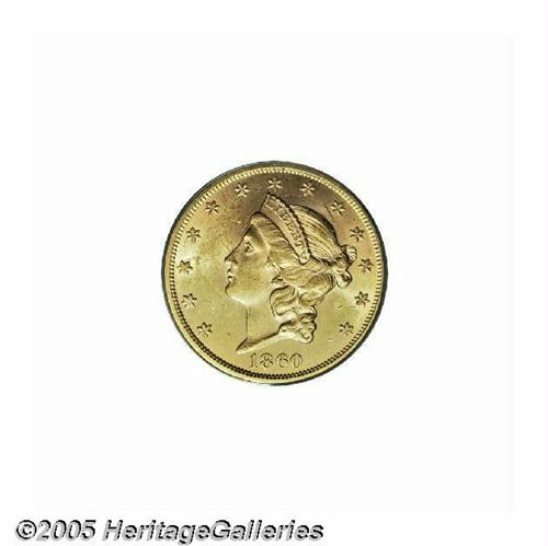 <B>1860<$20> MS61 PCGS.</B></I> Although hardly a common date, this issue (with a mintage of nearly 600,000 pieces) is one of the attainable Philadelphia Mint Type One double eagles in Mint State grade. It is much scarcer than the 1861 issue, the most plentiful of Type One twenty from this Mint. The peach-gold surfaces of this example are imbued with traces of light tan color on portions of the central devices, and exhibit some grade-limiting contact marks and scuffs on Liberty's face and neck and in the left (facing) obverse field. All of the design elements reveal relatively strong definition. Population: 17 in 61, 14 finer (6/05).