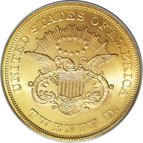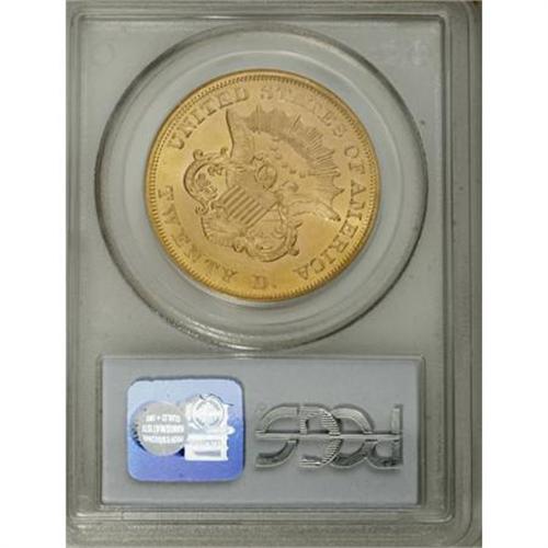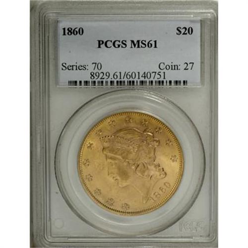 <B>1860 $20 MS61 PCGS.</B></I> The PCGS/NGC population data show that the 1860 double eagle is plentiful in circulated grades; Mint State grades are more challenging, however. The lustrous surfaces of this MS61 specimen display yellow-gold patina with hints of light tan, and exhibit well defined motifs. Some minute grazes and scuffs help define the grade. Population: 21 in 61, 17 finer (11/07).<BR><BR><B>Coin Engraver:</B> James B. Longacre<BR><BR><b>Shipping:</b> Coins & Currency (<a target="_blank" href="http://www.heritageauctions.com/common/shipping.php">view shipping information</a>)