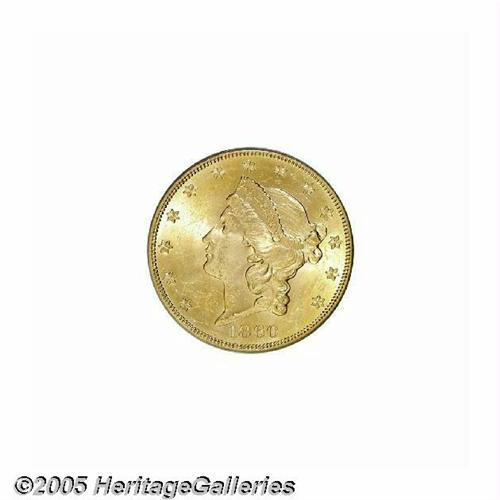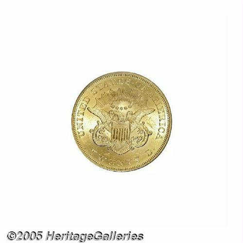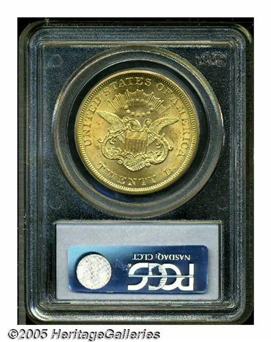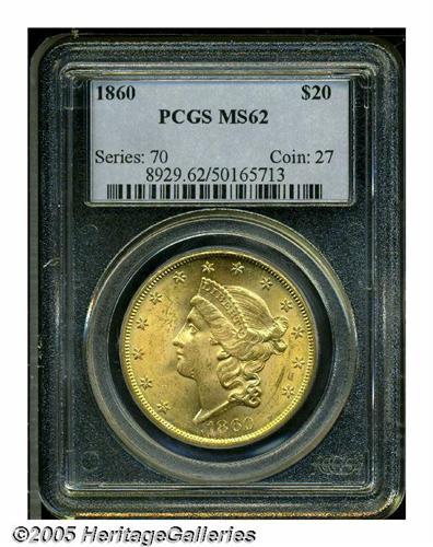 <B>1860<$20> MS62 PCGS.</B></I> Although hardly a common date, this issue is one of the attainable Philadelphia Mint Type One Double Eagles in Mint State grade. It is much scarcer than the 1861 issue, the most plentiful of Type One twenty from this Mint. This example just misses the Condition Census for the date. It has highly lustrous and frosty yellow-gold surfaces with only a slight trace of pinkish color. The surfaces are lightly abraded, yet quite pleasing for the grade. Identifiable by a two reed mark on Liberty's chin. Population: 5 in 62, 9 finer (6/05).