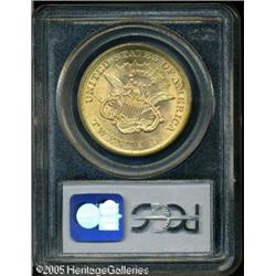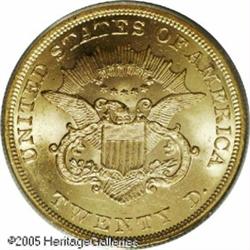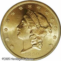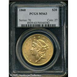 <B>1860 $20 MS63 PCGS.</B></I> This is an extremely important opportunity, as this date is anything but common in Mint State grades. It is a fully brilliant example with frosty yellow-gold luster and wisps of pinkish color. A few slight abrasions and lines keep this from the Choice MS64 grade level. With the massive gold discoveries in California, construction and operation of the San Francisco Mint meant that much less gold had to be shipped back to Philadelphia, thus much lower mintages resulted. Population: 7 in 63, 3 finer (1/05). Lot:8992
