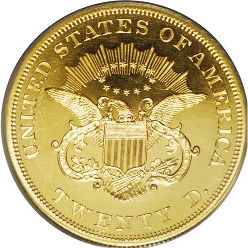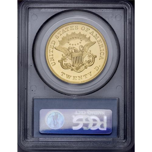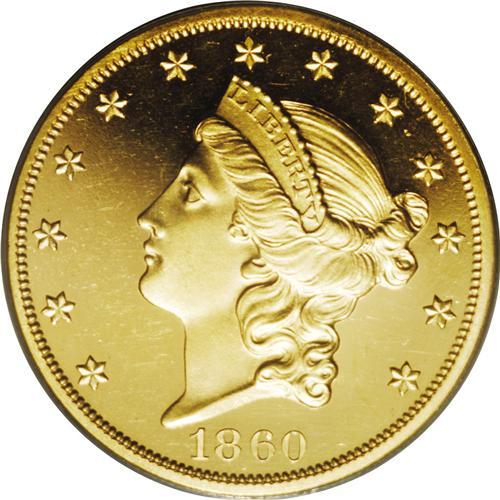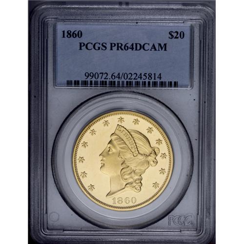 <B>1860<$20> PR64 Deep Cameo PCGS.</B></I> It is perhaps a strong statement that the remarkable Harry Bass collection did not contain a proof example of this issue. Neither did the Eliasberg, Pittman, and Norweb collections. With its absence from these and other important collections of gold coinage, it is clear that this issue is a prominent rarity in proof format. In fact, we are aware of less than 10 examples known to exist, from a mintage of 59 pieces. Only seven examples were recorded in the Trompeter notes, and possibly one or two others exist. Among these coins are the Smithsonian Institution and ANS specimens. The present specimen is from the gold collection of Jacksonville businessman Samuel W. Wolfson, sold at auction by Stack's in 1962.<BR> This beautiful near-Gem proof has heavily frosted motifs of light yellow-gold color, with deeply mirrored fields on both sides. All design details are boldly struck and fully defined. A few wispy hairlines in the field only distract slightly from the overall eye appeal of this remarkable double eagle. Both sides have wavy fields, often seen on proof gold coinage during this and later years. Walter Breen noted that the date slants down slightly to the right, although we do not believe this is the case. The final digit is tilted slightly to the right, and it is this feature that creates an optical illusion, giving the appearance of a slanting date. The digits are all thin and delicately formed, and show the slightest doubling. The reverse border consists of unusually shaped, tapered dentils that are rather widely separated.<BR><I>Ex: Samuel W. Wolfson Collection, Part One (Stack's, 10/62), lot 872.</B></I><BR><I>From The Lake Highlands Collection.</B></I> <BR><BR><B>Important notice:</