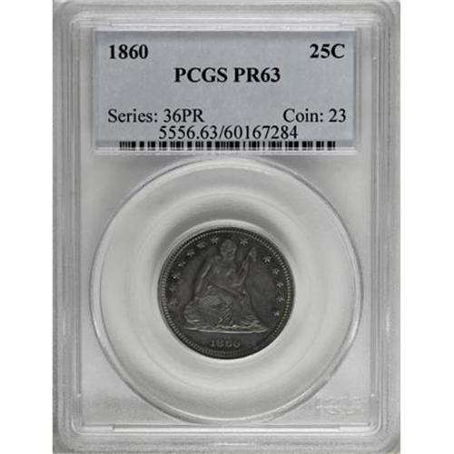 <B>1860 25C PR63 PCGS.</B></I> Larry Briggs (1991) writes that 458 of the 1,000 proofs made in 1860 were melted. Golden-tan and light blue patina on the obverse yields to medium intensity cobalt-blue and lavender on the reverse. Sharply struck, save for the usual softness in some of the star centers. Some unobtrusive handling marks on the obverse preclude a higher grade.<BR><I>From The Beau Clerc Collection.</B></I><BR><BR><B>Coin Engraver:</B> Christian Gobrecht<BR><BR><b>Shipping:</b> Coins & Currency (<a target="_blank" href="http://www.heritageauctions.com/common/shipping.php">view shipping information</a>)