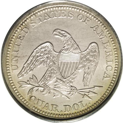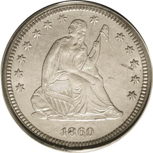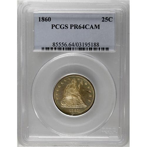 <B>1860<25C> PR64 Cameo PCGS.</B></I> Type Two Reverse. This exactingly struck near-Gem is draped in medium chestnut-gray patina. The smooth fields are suitably mirrored, and contrast with the delicately frosted devices. A subtle, thin planchet streak to the N in UNITED provides an identifier. Population: 6 in 64 Cameo, 5 finer (6/06).<BR><I>From The Mulholland Collection.</B></I>
